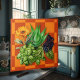 Ceramic kitchen wall tile with medicinal herbs design. Aloe vera, elderberries, basil and yellow flowering calendula are featured over a rust and orange, blocks background. Use as an accent mixed with other tiles for a backsplash or other wall area.