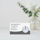 Este cartão de visita é criado com um casaco de laboratório médico e um gráfico estetoscópico em segundo plano e texto personalizado que você pode personalizar online. Projetado para um escritório médico, médico ou serviço de seguro de saúde.