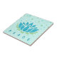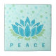 Este design de sereno tem uma flor de lótus azul sobre um fundo ligeiramente texturizado, com bolhas azuis e verdes flutuando.