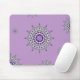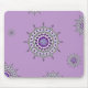 Este design de círculo concêntrico prateado e roxo, inspirado pela médi indiana e figurinos de anime japonês, apresenta camadas com pétalas de lótus, folhas, paisley e uma roda ornamental ao redor de tudo isso.