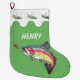 Arranha-Arco Voa Pescada De Natal. Personalize esta estocagem com um nome. A truta arco-íris está pulando por isca. Três lures verdes gradados a verdes escuros no topo. O topo da inicialização é um design de onda em branco. Tudo isso foi desenhado à mão e desenhado e colorido d'água por mim, Tina of Fisheries Hunting Life, e então se tornou digital. Prefeito para o pescador de moscas ou o angler!