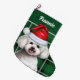Uma meia festiva de Natal tem uma ilustração com aquarelas de um cachorro bonitinho Bichon Frise vestindo um chapéu de Papai Noel em uma xadrez verde festiva, com o nome de seu filhote em ambos os lados.