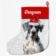 Tão doce, esta meia de Natal de dois lados tem uma ilustração com aquarela de um cão Grande Dane vestido de férias com um chapéu de elfo e o nome do seu filhote em ambos os lados com um fundo de arte de palavras-coradas.