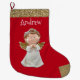 A Cute Angel Christmas Stocking with your child's name, designed in bright red with gold colored trim. To personalize simply insert the first name into our easy template, replacing the sample. Your child will love it.