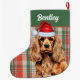 Xadrez vermelha e verde suave para uma sensação sazonal nesta meia de Natal de dois lados tem uma ilustração de cor d'água da legal aparência de Cocker Spaniel e do nome do seu filhote de ambos os lados.