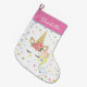 Crianças personalizadas estocadas de natal unicórnio, apresentando um unicórnio mágico bonito com buzina dourada, cabelos arco-íris, estrelas arco-íris e letra elegante para o seu nome.