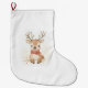 Foco de Natal com uma rena bebê sentada na neve vestindo um cachecol vermelho