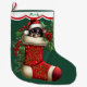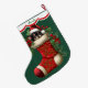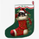 Esta meia de Férias tem uma imagem de um adorável filhote preto e bronzeado Chihuahua a espreitar de uma estocagem vermelha ornamentado. A imagem está rodeada de bagas ocas, vermelhas, e poinsettia floresce, e é colocada sobre um fundo verde de Natal. Um design branco de borda escalada, bordado em vermelho, mantém seu nome personalizado no topo. A parte de trás da estocagem é idêntica à da frente.