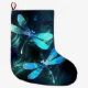 Duas libélulas transparentes, luminosas, turquesas, desenhadas artisticamente sobre fundo noturno, com algas e vagalumes luminescentes do lago. Dragonfly brilhante.
