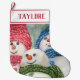 Uma meia legal do Natal da família da neve que você possa personalizar com seu próprio nome. 3 bonecos de neve que vestem scarves e a engrenagem principal nas cores de verde, de vermelho, e no azul com harmonização abotoam-se abaixo de suas barrigas dianteiras