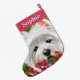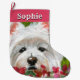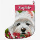 West Highland White Terrier e flores rosa. Cachorro ocidental a espreitar por um arbusto florescente. Sophie. Copyright © 2025 Angi Laframboise. Todos os direitos reservados. Dons de cães de arte para amantes de cães.