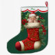 Todos sabemos que Papai Noel é mágico (certo?!), então não deveria ser surpreendente que ele possa se esconder em um estoque de Natal! Aqui está ele, espiando uma estocagem de ornamentado que está cheia de bagas ocas, vermelhas, e poinsettia floresce. Aposto que há doces e brinquedos no fundo! Um design branco de borda escalada, bordado em vermelho, mantém seu nome personalizado no topo. A parte de trás da estocagem é idêntica à da frente.