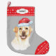 A frente desta estocagem de Férias mostra uma imagem de um ouro Labrador Retriever vestindo um chapéu de Papai Noel. A imagem é colocada sobre um fundo de cinza prateada, e o dedo e a borda superior são um padrão vermelho e branco de floco de neve. Na borda superior está um rótulo branco com seu texto personalizado em cinzas escuras. A parte de trás da estocagem é o mesmo padrão vermelho e branco de flocos de neve.