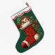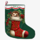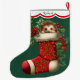 Esta estocagem de Feriados tem uma imagem de um adorável ouriço bebê espiando um estoque de vermelho ornamentado. A imagem está rodeada de bagas ocas, vermelhas, e poinsettia floresce, e é colocada sobre um fundo verde de Natal. Um design branco de borda escalada, bordado em vermelho, mantém seu nome personalizado no topo. A parte de trás da estocagem é idêntica à da frente.