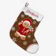 Sweeten up your holiday décor with this charming gingerbread girl Christmas stocking! Featuring a gingerbread cookie girl dressed in a red hooded dress with white trim, holding two peppermint lollipops, this design is full of festive personality. Surrounded by snowflakes on a brown background, this stocking is perfect for children, families, and gingerbread lovers. Add a name for a personalized touch that makes Christmas morning even more special.