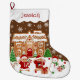 Create a magical holiday moment with this gingerbread house cookie stocking! This detailed design showcases a whimsical gingerbread house surrounded by cookie trees, candy canes, peppermint lollipops, a gingerbread man, a snowman, and a gift box. With a brown background sprinkled with snowflakes, it brings cozy, nostalgic charm to your home. Perfect for gingerbread house enthusiasts, holiday bakers, or anyone who loves whimsical Christmas designs.