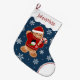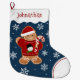 Bring cozy holiday cheer to your mantel with this adorable gingerbread man Christmas stocking! This festive design features a smiling gingerbread cookie wearing a red puffy sweater with a snowman design, a Santa hat, and holding a candy cane. Set on a classic blue background with delicate white snowflakes, this stocking captures the warmth and sweetness of Christmas. Perfect for holiday décor, family stockings, or as a personalized gift for kids and cookie lovers.