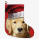 Um golden retriever bonito que veste um chapéu de Papai Noel para o Natal