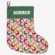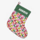 Adicione alguma alegria aos presentes de Natal com esta estocagem padronizada que apresenta um padrão geométrico simples numa paleta colorida de vermelho, verde limão, laranja, rosa e verde na parte de trás branca, nos anos setenta. Seu nome aparece no topo em letras brancas retroradas em um fundo verde.