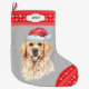 A frente deste estoque de Férias mostra uma imagem de um Retriever de Ouro vestindo um chapéu de Papai Noel. A imagem é colocada sobre um fundo de cinza prateada, e o dedo e a borda superior são um padrão vermelho e branco de floco de neve. Na borda superior está um rótulo branco com seu texto personalizado em cinzas escuras. A parte de trás da estocagem é o mesmo padrão vermelho e branco de flocos de neve.