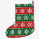 Scandinavian-inspired faux-knit pattern of snowflakes, diamonds, and festive stripes in red, green, white, and gold.