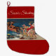O ninho de Natal com o Patriótico Papai Noel na manga cheia de presentes e bandeira americana voando durante a noite. O lado frontal impresso apenas com o painel vermelho na parte traseira.