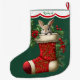 Esta meia de Feriado tem uma imagem de um adorável coelho de bebê espiando um ornamentado de estocagem vermelha. A imagem está rodeada de bagas ocas, vermelhas, e poinsettia floresce, e é colocada sobre um fundo verde de Natal. Um design branco de borda escalada, bordado em vermelho, mantém seu nome personalizado no topo. A parte de trás da estocagem é idêntica à da frente.
