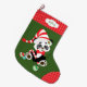 Um urso panda branco e preto bonito veste um boné estocante vermelho e branco e segura uma cana doce na frente dessa meia brilhante e colorida. Alguns bolbos de árvores vermelhas, azuis e verdes estão espalhados pelo urso. Ele veste uma gravata vermelha de arco polkadot, que corresponde ao dedo e à borda superior. Na borda superior está um rótulo branco com o texto personalizado em verde, que corresponde à cor de fundo. A parte de trás da estocagem tem o mesmo padrão de polkadot. Excelente para um menino ou para uma menina!