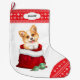 Um adorável cachorrinho de Pembroke Welsh Corgi pop de um saco de presente vermelho na frente desta estocagem de Natal. Algumas bolbos de árvore de Natal em forma de lacre e padrão dourado ficam bem na frente do saco de Papais noeis A imagem é colocada sobre um fundo branco, e o dedo e borda superior são um padrão vermelho e branco de floco de neve. Na borda superior está um rótulo branco com seu texto personalizado em cinzas escuras. A parte de trás da estocagem tem o mesmo padrão vermelho e branco de flocos de neve.
