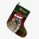 Uma meia natalícia festiva tem uma ilustração com aquarelas de um bonito Tervuren belga vestindo um chapéu de Papai Noel num vermelho festivo, ouro e xadrez verde, com o nome do seu filhote em ambos os lados.