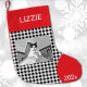 Trendy pet Christmas stocking featuring your pet photo, black and white buffalo check background, red top and toe and white name across the top. The back is a solid red. Dimension: 9" x 16". Easily change the name, edit or remove the year on the toe, and add your own photo using the Template provided. Excellent print and quality materials. See "About This Product" for more information. Made in the USA.