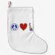Compartilhe do amor para o estado da maravilha de Delaware pequeno esta época natalícia com uma meia do Natal de Delaware do amor da paz que caracterize um sinal de paz azul grande, um coração vermelho com esboço vermelho e a bandeira de Delaware na forma do mapa da silhueta do estado.