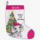 Elefante doce e adorável com boné de estocagem de inverno cor-de-rosa decorando uma árvore de Natal. Titular o PRIMEIRO NATAL de BABY em uma fonte moderna escrita à mão e personalizada com o nome do bebê. Entre em contato com o designer por meio do Zazzle Chat ou makeitaboutyoustore@gmail.com se você quiser que este design seja modificado, em outro produto ou quiser coordenar itens.