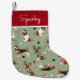 Gaivotas bonitas vestidas em roupas festivas de feriado, chapéus de Santa e blusas de argila com Enfeites de natal espalhados em um fundo verde com nome de animal personalizado.