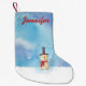 Uma meia de Natal personalizada com uma ilustração fofa de bonitinha. Ele está vestindo um chapéu preto de cachimbo, segurando um clássico cachimbo de milho, e vestindo um cachecol vermelho. Ficando na neve branca fria sorrindo e balançando olá. O fundo é composto por um céu com aquarelas com cores azuis e roxas se misturando e se misturando. Personalize com um nome em vermelho festivo.