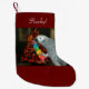 Papagaio-Cinza africano brincando com um brinquedo em frente à Árvore de Natal.