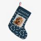 Give your favorite furry friend their very own Christmas stocking this holiday season. Personalize the dog Christmas stocking by adding your dog's name and photo with a pattern of white bones and snow against a dark navy background.