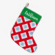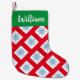 Flocos de neve de azul sobre um fundo de cobrir vermelho brilhante nesta meia de férias. Personalize com o nome das iniciais do seu elfo favorito.