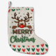 A cute, personalized Christmas stocking featuring a cheerful reindeer and "Merry & Christmas" text on a festive heart background. Perfect for holiday gifts and décor.