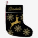 Esta meia de Natal bonita tem um design de vidro chic com uma falsa rena de ouro com brilho em um fundo preto elegante com falso falso floco de neve de ouro com brilho. O nome tem um script vintage branco personalizável em um plano de fundo preto. Ordene um agora para trazer a alegria de Natal em sua casa!