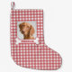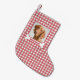 Uma meia de Natal vermelha e branca para cachorro, com uma foto quadrada e um nome personalizado em um osso branco, abaixo, e um xadrez de quadrados vermelhos e brancos como fundo.