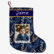 Bela estocagem personalizada com a fotografia e o nome do menino. Bonito fundo azul com sotaque foliar dourado. Carregue a foto do seu filho e adicione seu nome na área de personalização.