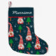 Esta é uma lindíssima estocagem de Natal personalizada, com padrão de gnomos vermelhos segurando presentes, doces de Natal e Enfeites de natal com árvores de Natal e flocos de neve sobre fundo azul escuro.