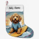 Goldendoodle Dog surfing on a surfboard Christmas stocking. Add this image to other products. Add your own text too. Lots of pets in my stores.