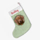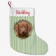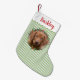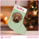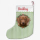 Celebre o Natal com seu melhor amigo com esta encantadora meia de Natal para cães que apresenta um padrão clássico de listras verdes. Acentuada com uma guirlanda de folhas persistentes com bagas vermelhas e uma borda com recorte em forma de ondas trendy, este design adicionará um toque divertido à sua prateleira de lareira. Adicione o nome e a foto do seu cão para criar uma adição única à sua decoração de Natal. Faz um ótimo presente para amantes de cães.