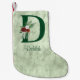 O design de férias bonito e festivo apresenta a letra maiúscula D com enchimento de shimmer verde e embelezado com flores de inverno e buquê de aquarelas foliage sobre fundo de harlequin verde escamoteado. Personalizar com nome ou outra mensagem