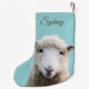 Lâmpada em azul, estoque de Natal personalizado impresso em ambos os lados para pendurar qualquer que seja a maneira que você escolher. Ou escolha a cor vermelha inversa. Uma pequena ovelha fofa a olhar de fundo azul-claro neste estoque de férias com o nome modelo na letra do script. Para a família do amante de os animais ou fazenda.