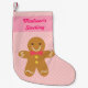 Uma meia bonito para o pouco umas para encher poucos presentes do Natal. O design vem com uns desenhos animados bonitos de um homem de pão-de-espécie feliz com gotas amarelas da goma como botões e do glacé branco para decorações. Um design alegre e alegre para Feliz Natal e estações festivas! Um teste padrão doce de corações cor-de-rosa e dos pontos brancos para o fundo. Personalize com nome da criança.