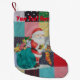 Esta tradicional estocagem de natal no estilo do chique de natal tem uma fotografia de Papai Noel com seu saco cheio de presentes todos embrulhados e prontos para o parto do dia de Natal, você pode ver um ursinho amarelo com um arco vermelho e um coelho azul apenas saindo do topo do saco verde. Pai Natal está segurando um estoque de natal vermelho colorido e listrado de ouro que tem um bastão doce e presentes menores, ele também está segurando um pequeno presente embrulhado em sua mão A ilustração fofa está em um fundo original colorido de retalhos para dar a ela uma aparência de chique-vintage. A imagem original dos papais noeis é uma pintura a cores da água que eu criei alguns anos atrás. A imagem festiva colorida e tradicional parece excelente nesta meia gira. O fundo da manta de retalhos é uma fotografia do meu próprio cobertor de retalhos que foi montado usando tecidos retrorreflectores. Eu acho que esta estocagem de natal original será perfeita para o incêndio de Natal. Este é um estoque personalizável, você pode personalizá-lo com seu próprio texto.