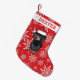 Meia bonito engraçada do feriado do Natal para seu animal de estimação que caracteriza um cão do dachshund que veste um chapéu vermelho do xmas, seu nome, um fundo vermelho tradicional que possam ser mudados a toda a cor, e uma dispersão de flocos de neve do branco do inverno.